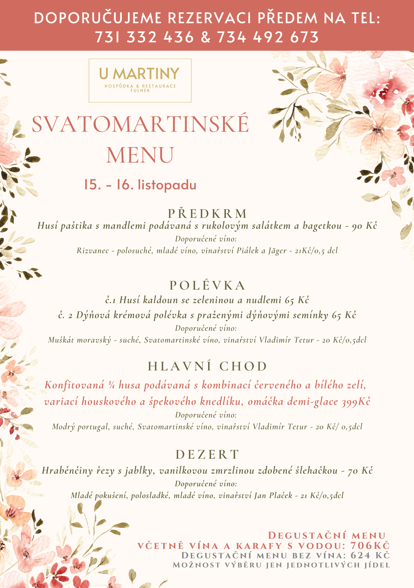 15.–16. listopadu pro vás chystáme tradiční SVATOMARTINSKÉ MENU plné chutí, vůní a mladého vína. Degustační menu včetně vína a karafy s vodou: 706 Kč Rezervace doporučujeme předem: 731 332 436 / 734 492 673